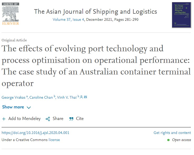 The academic paper titled “The effects of evolving port technology and process optimisation on operational performance: The case study of an Australian container terminal operator” was co-authored with Dr Vinh Thai and Dr Caroline Chan and published in the Asian Journal of Shipping and Logistics in December 2021.